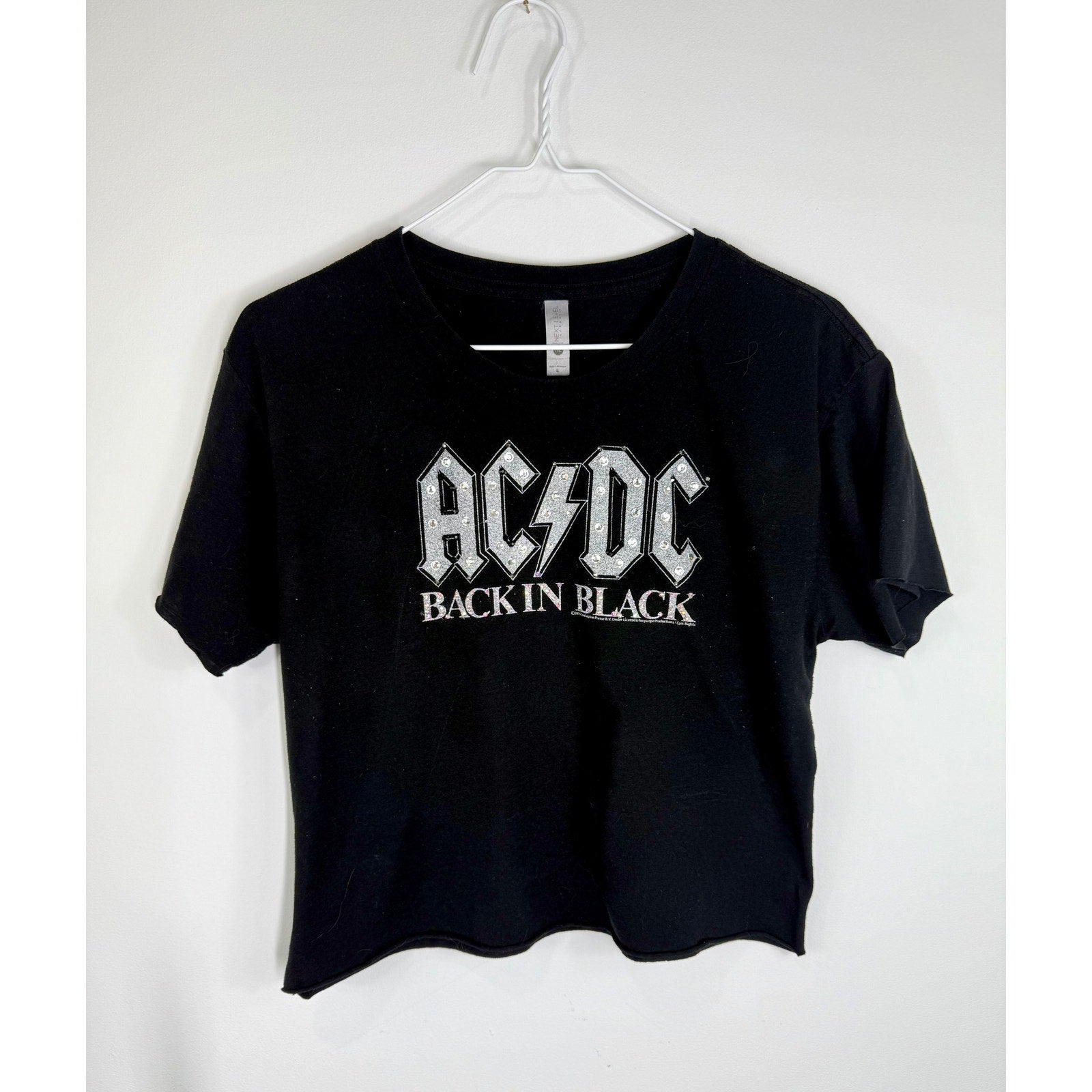 The product is an authentic ACDC vintage Back in Black black tee with rhinestones, made of 100% cotton knit fabric. It is machine washable and designed for women with a casual shirt sleeved cropped style.The tee features rhinestone accents and is branded as authentic, perfect for those who appreciate rock and music themes in their clothing. Made in Nicaragua, this versatile t-shirt can be worn in all seasons, adding a touch of music-inspired style to any outfit.