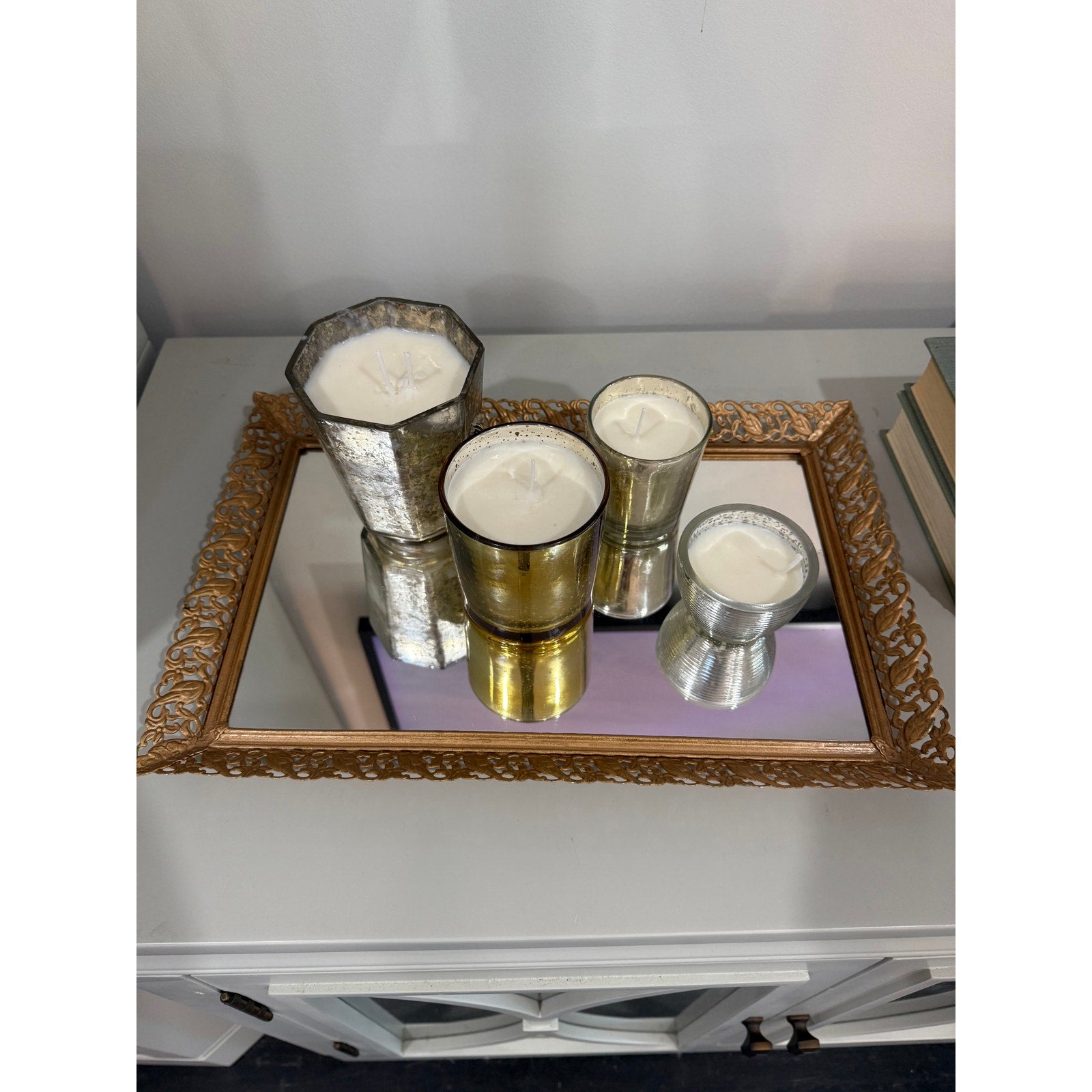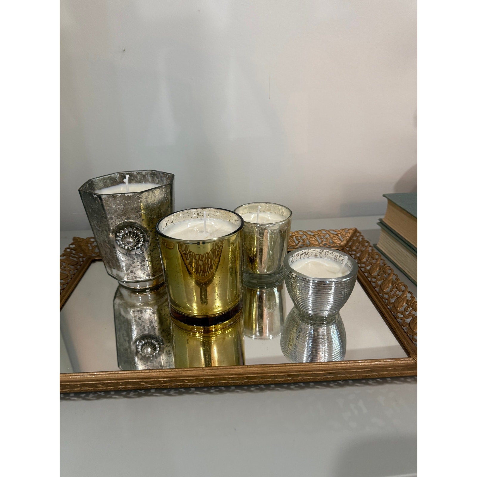 Add a touch of vintage charm to your home with this exquisite candle collection of lemon , bergamot, sea breeze candles in gold and silver mercury glass and arranged nestled on a vintage gold mirror tray. This unique piece combines the warm, comforting glow of a candle with the timeless elegance of crystal, making it a perfect addition to any room.