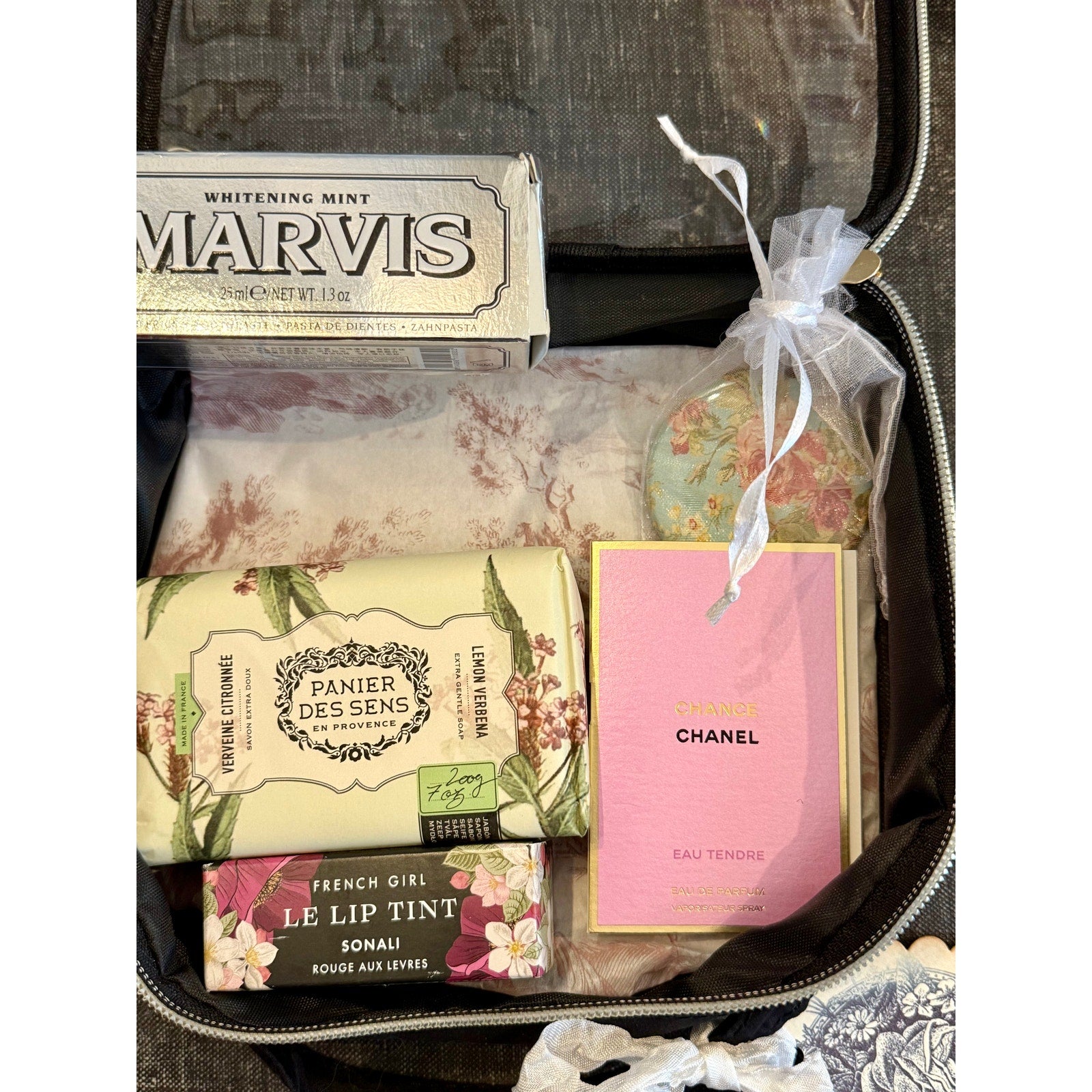 Marvis toothpaste, Panier de Sens Lemon Verbena soap, French Girl moisturizing lip balm, a Chanel Chance perfume sample, and a vintage pocket mirror, packaged in a clear travel zip up bag ready to travel! Also included a beautiful french vintage style gift tag