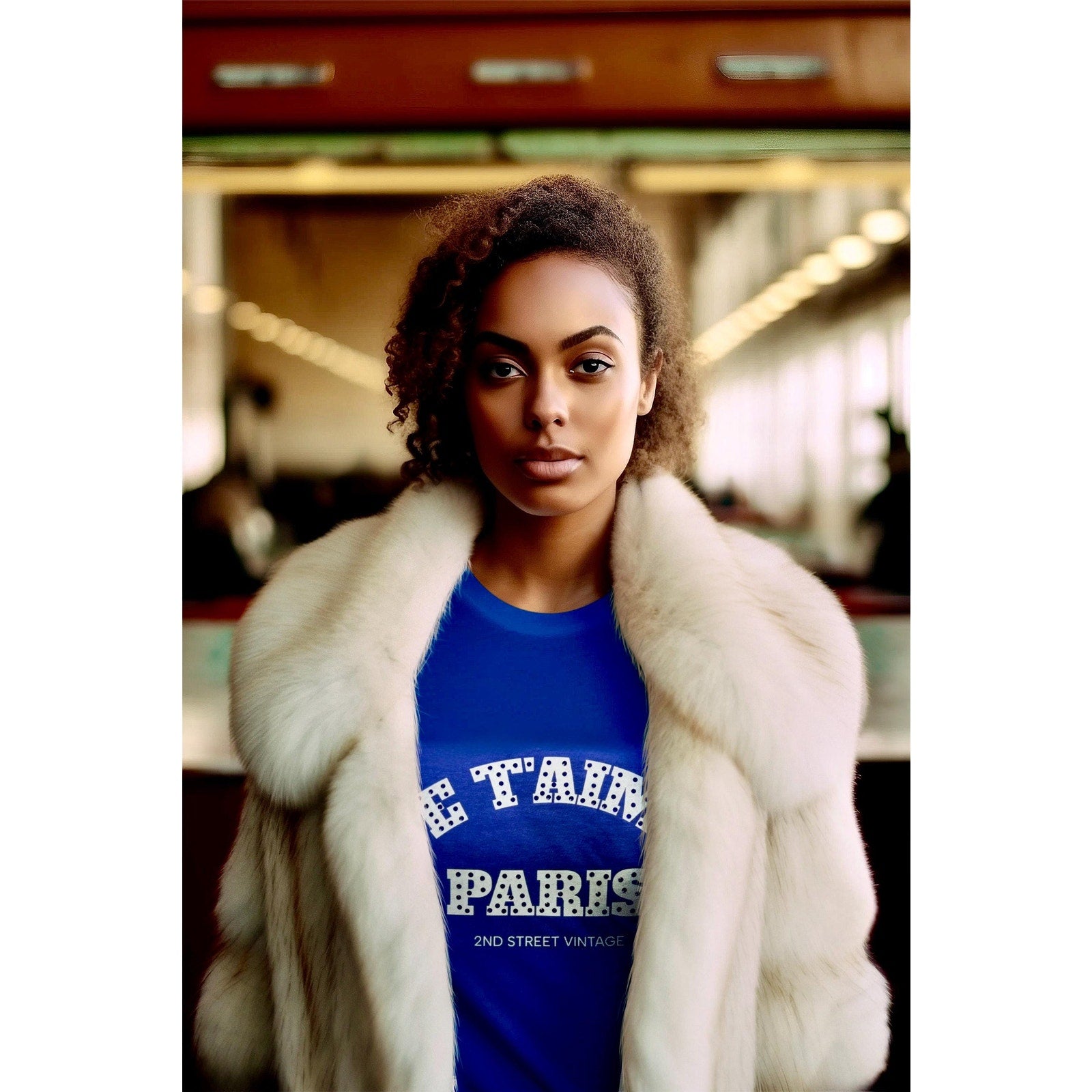 This design is based on a several vintage tee's that were discovered in Paris in an area renowned for being the world's largest flea market and a treasure trove of antiques and vintage items. We loved the color and fact that it was rhinestoned!