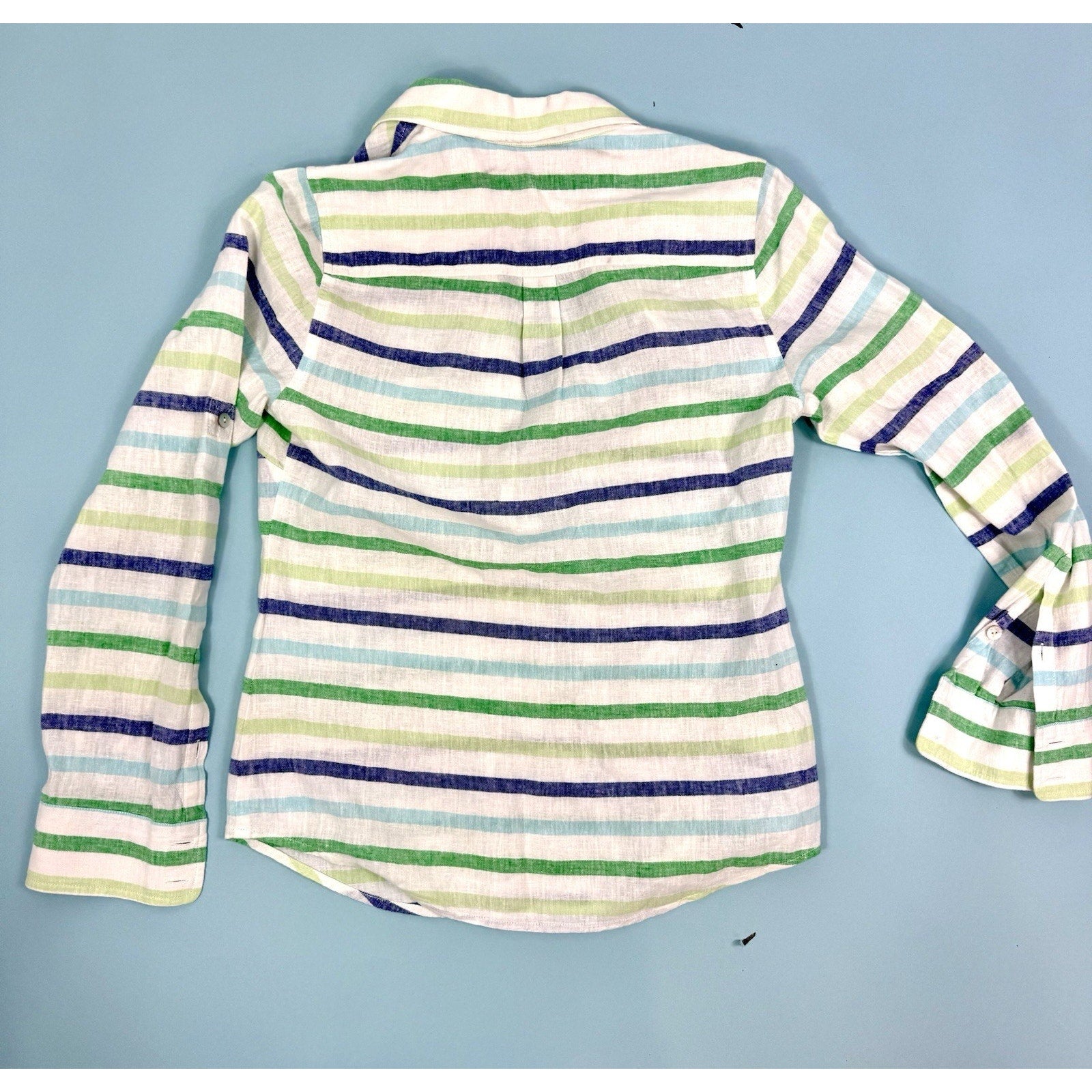 The Vineyard Vines Bungalow Stripe Popover Shirt for women is a classic and versatile addition to any wardrobe. Made from a comfortable linen and cotton blend with a striped pattern, this long sleeve blouse features a collared neckline, pullover closure, and button accents. Perfect for casual occasions, the shirt is designed with a regular fit and roll tab sleeves, making it suitable for all seasons. The green color and vintage style linen is light and breezy for summer while the high-quality material ensures easy care with machine washability. Perfect for the preppy girl going back to school for a timeless and stylish top.