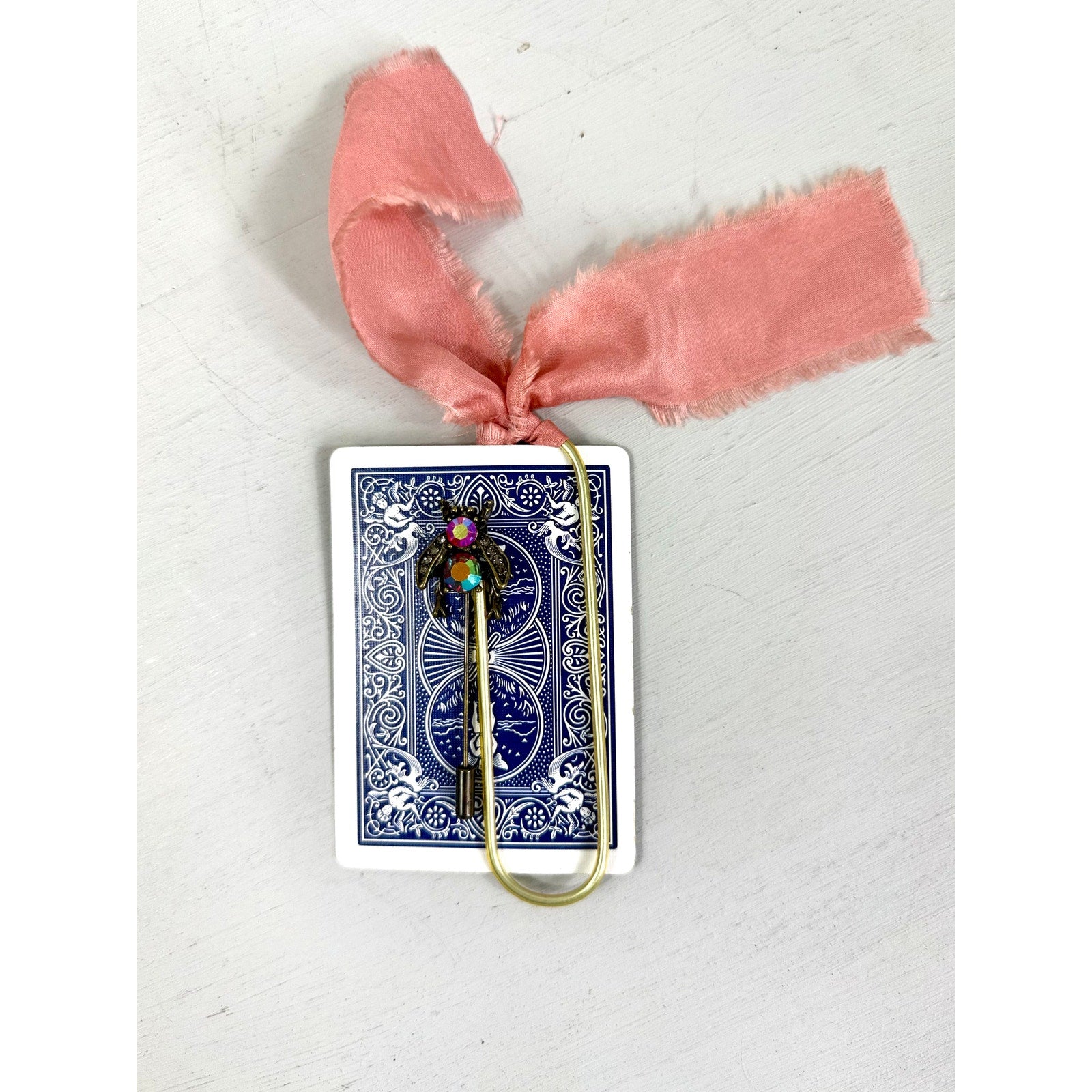 This delightful vintage set includes a charming bumble bee pin and a unique ribbon playing card bookmark. The bumble bee pin is intricately detailed and adds a touch of whimsy to any outfit.