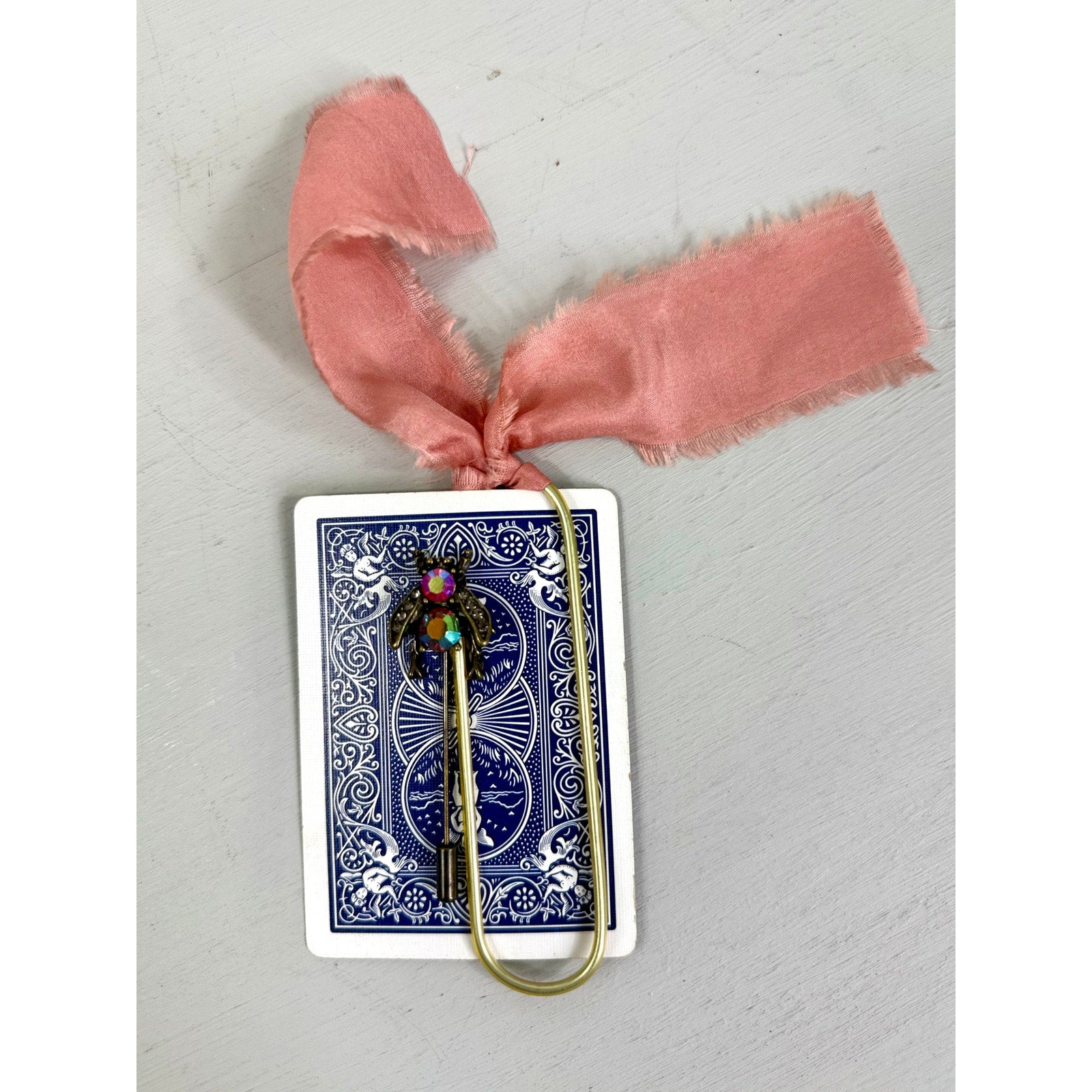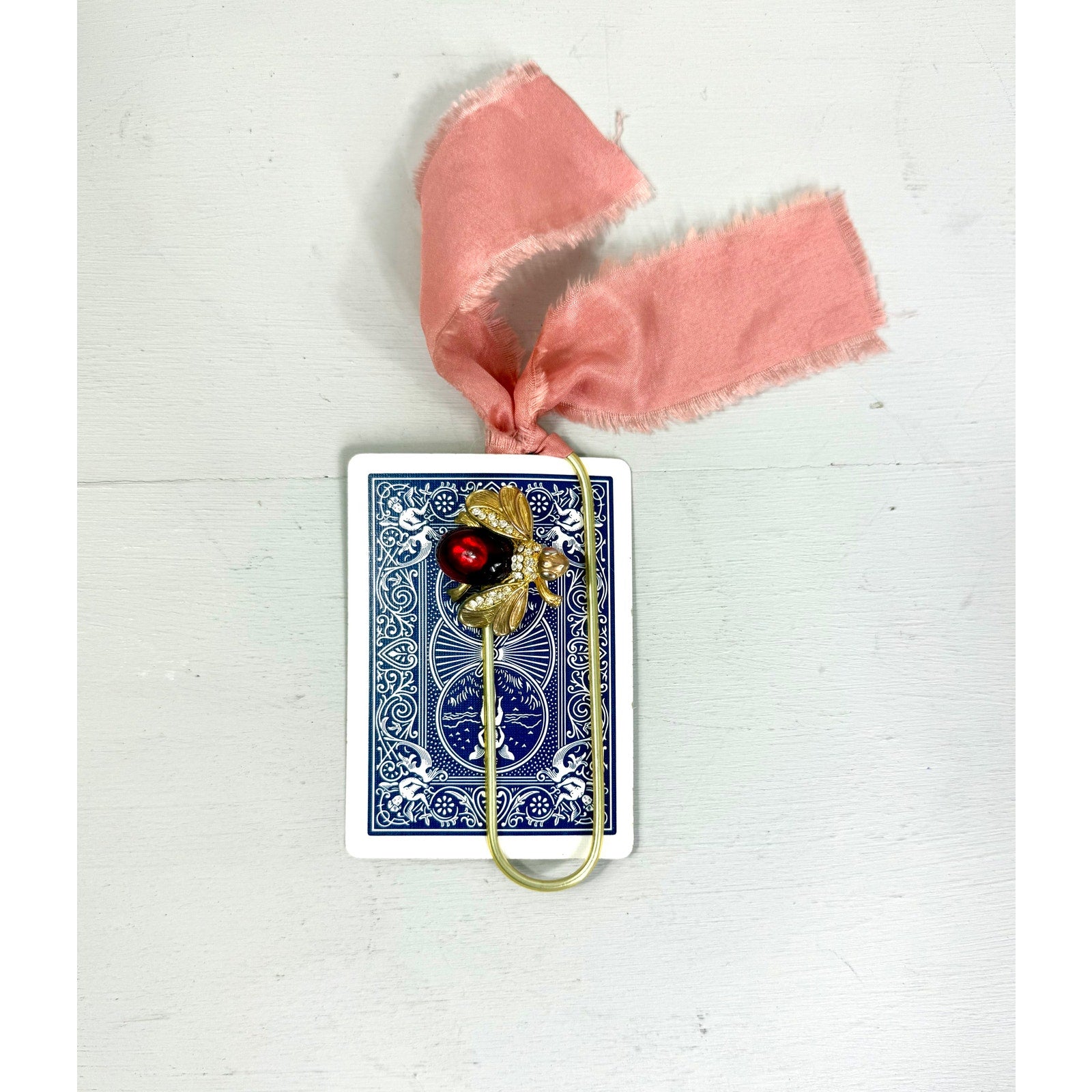 This delightful vintage set includes a charming bumble bee pin and a unique ribbon playing card bookmark. The bumble bee pin is intricately detailed and adds a touch of whimsy to any outfit.