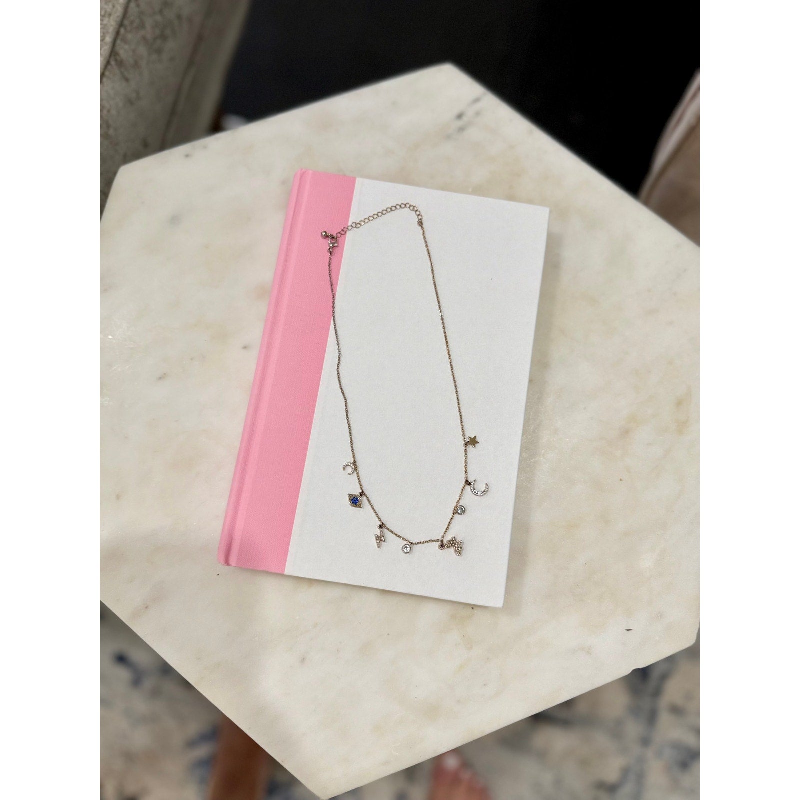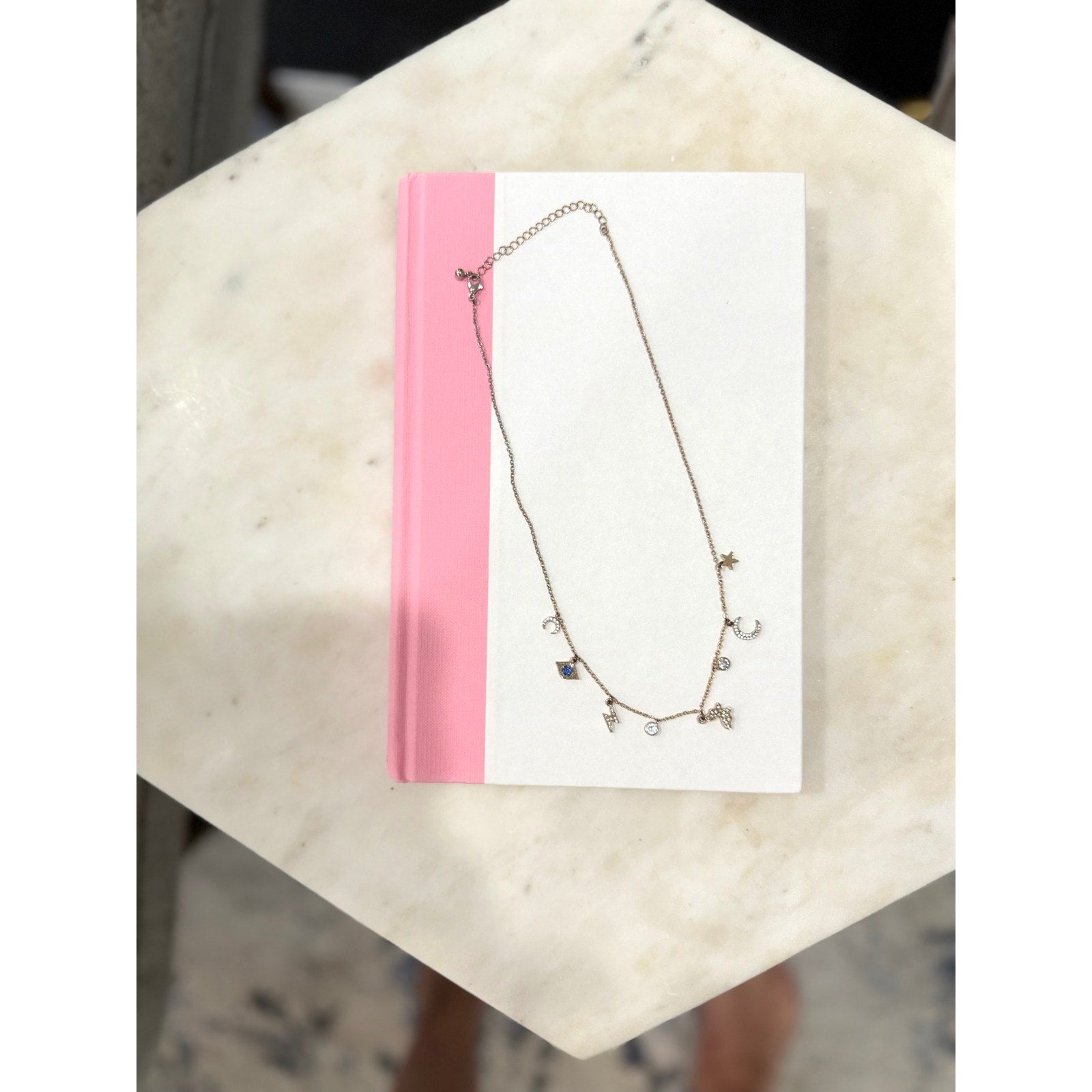 This Vintage Sterling Souvenir Vintage charm celestial necklace, vintage necklace, moon and star necklace is a classic piece of fine jewelry perfect for Christmas and birthday gifts. Made of sterling silver with a silver enamel charm, this adjustable 15-18 inch-bracelet features 8 charms including rhinestoned moons, a sapphire rhinestoned charm, a lighting bolt, two rhinestone charms, a rhinestoned butterfly, and a star. The bracelet comes from the United States and is a unique and original vintage piece that adds a touch of nostalgia to any jewelry collection. The charm bracelet is ideal for women who appreciate vintage accessories with a touch of history and character.