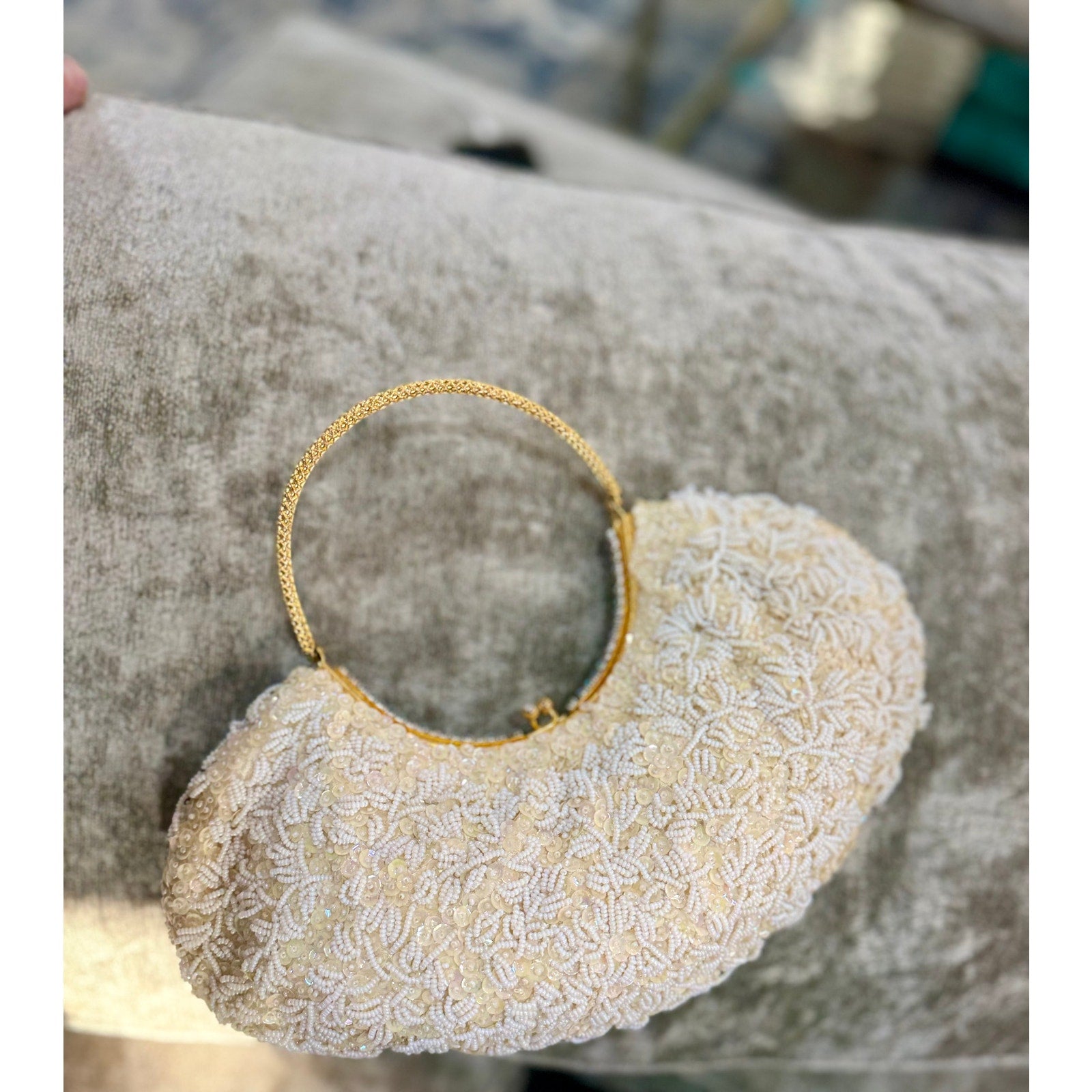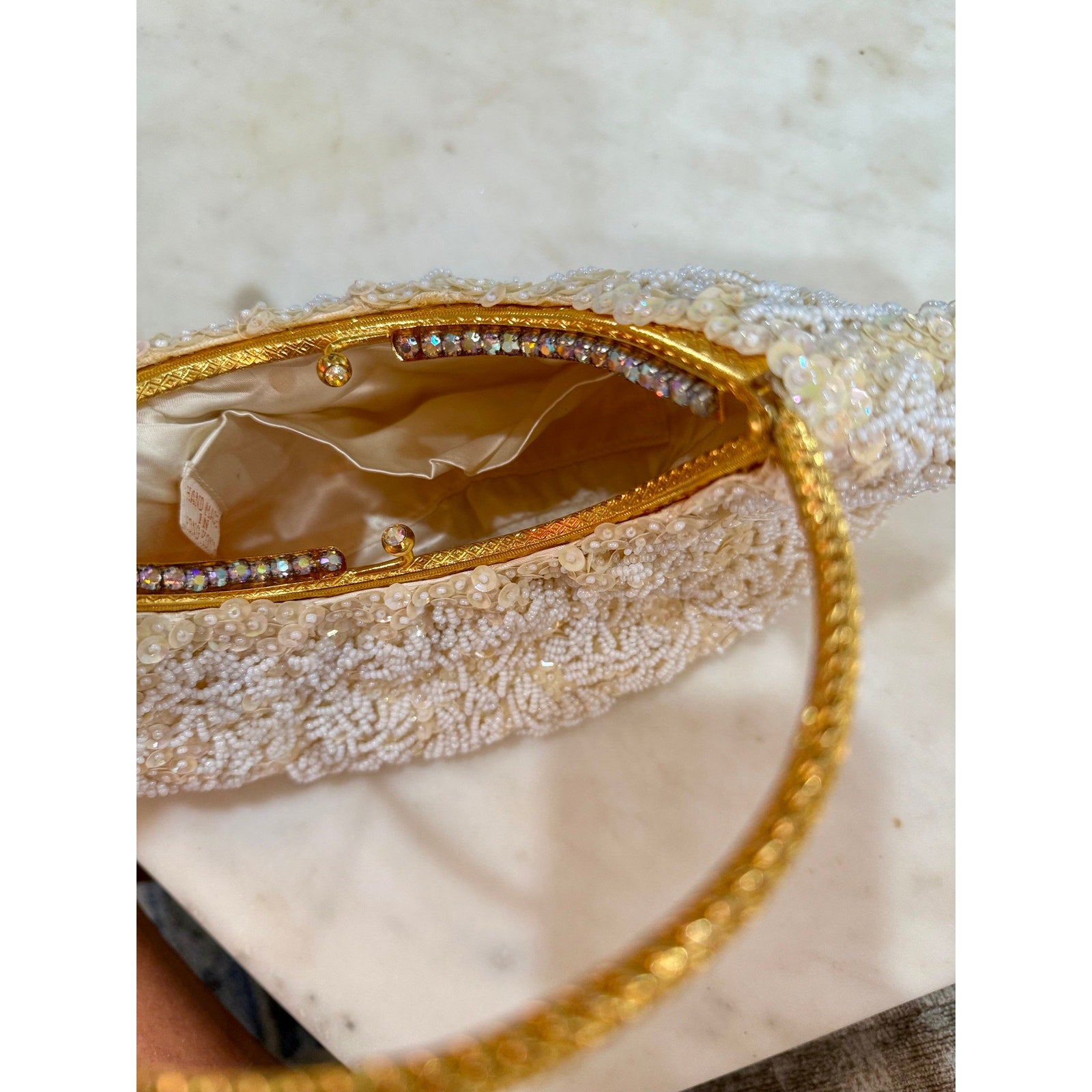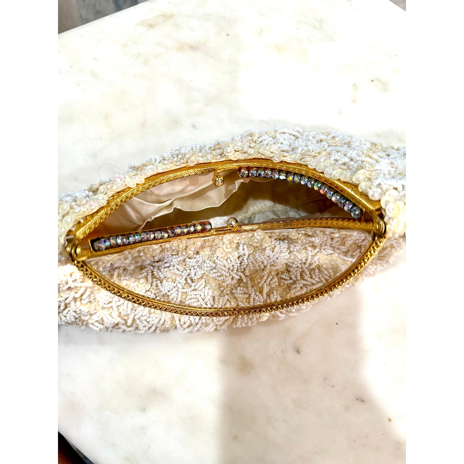 Vintage cream and white beaded and rhinestoned evening bag with gorgeous gold handle