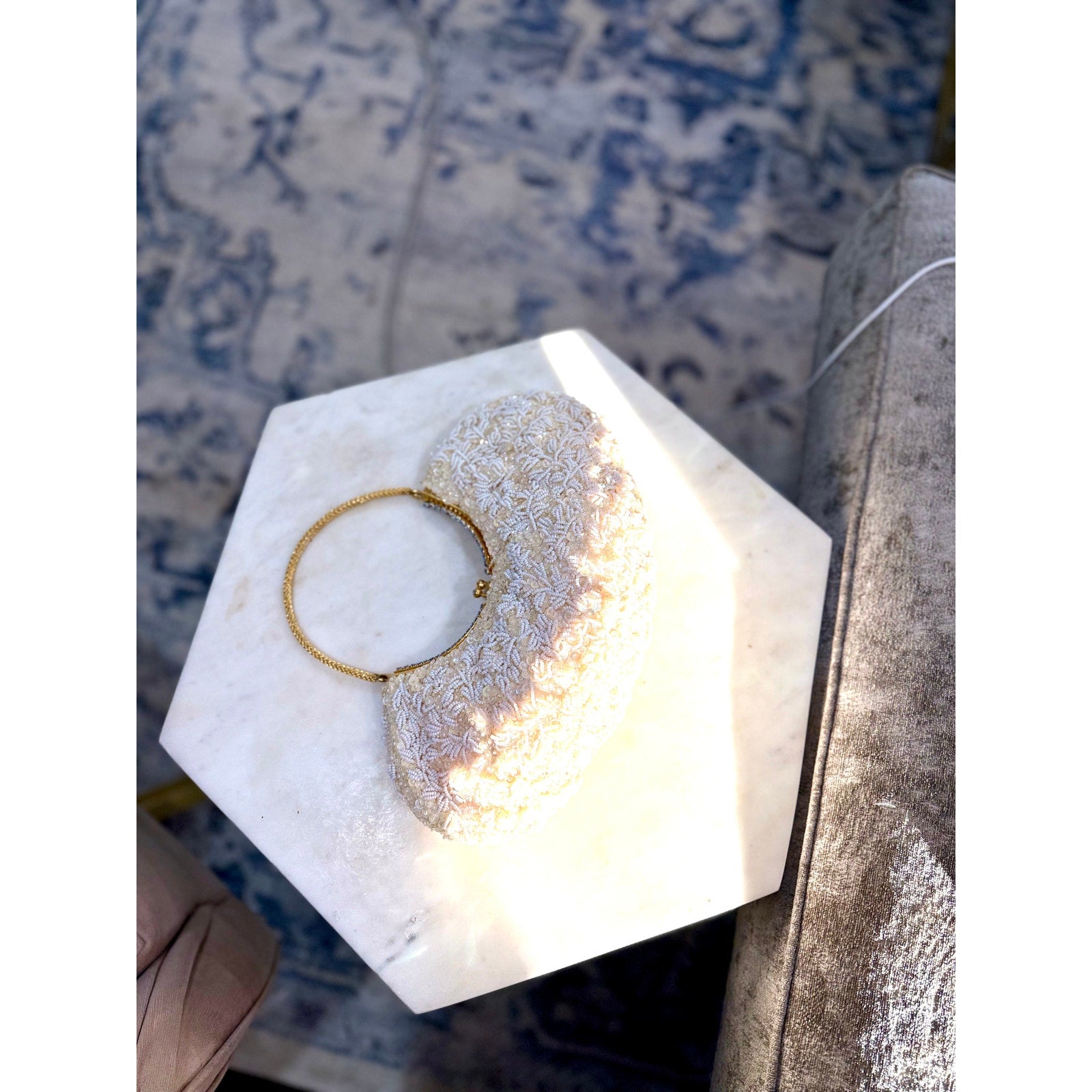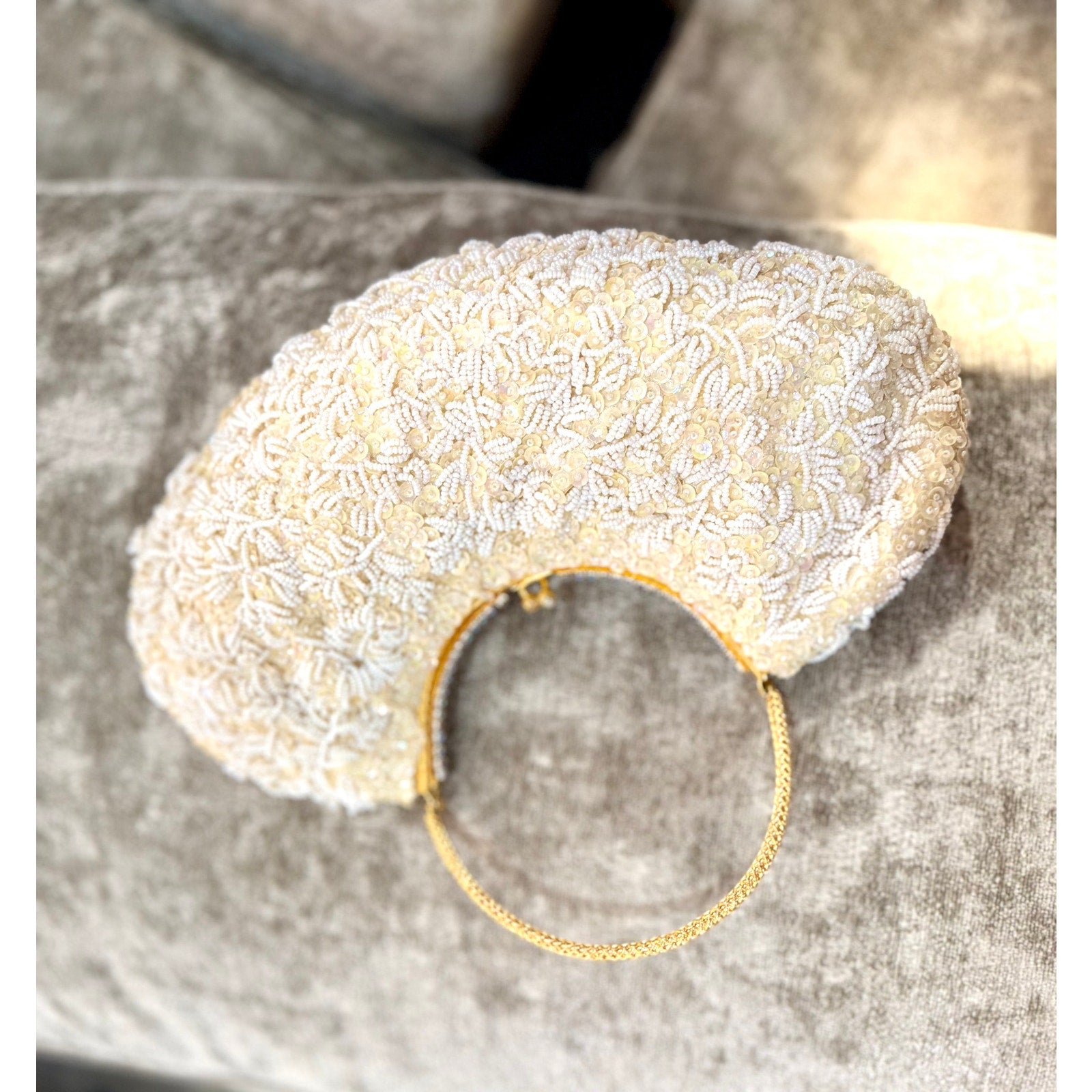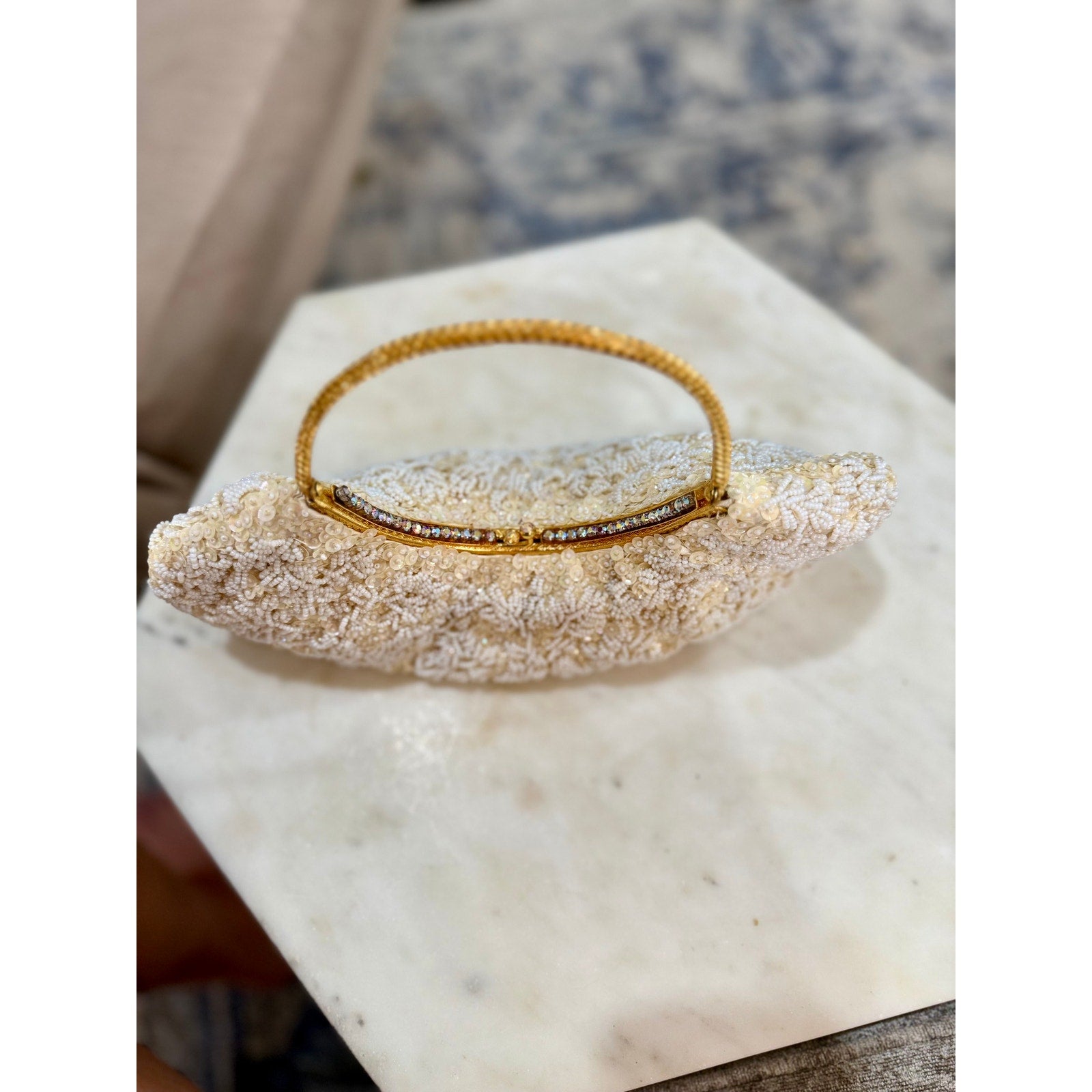 Vintage cream and white beaded and rhinestoned evening bag with gorgeous gold handle