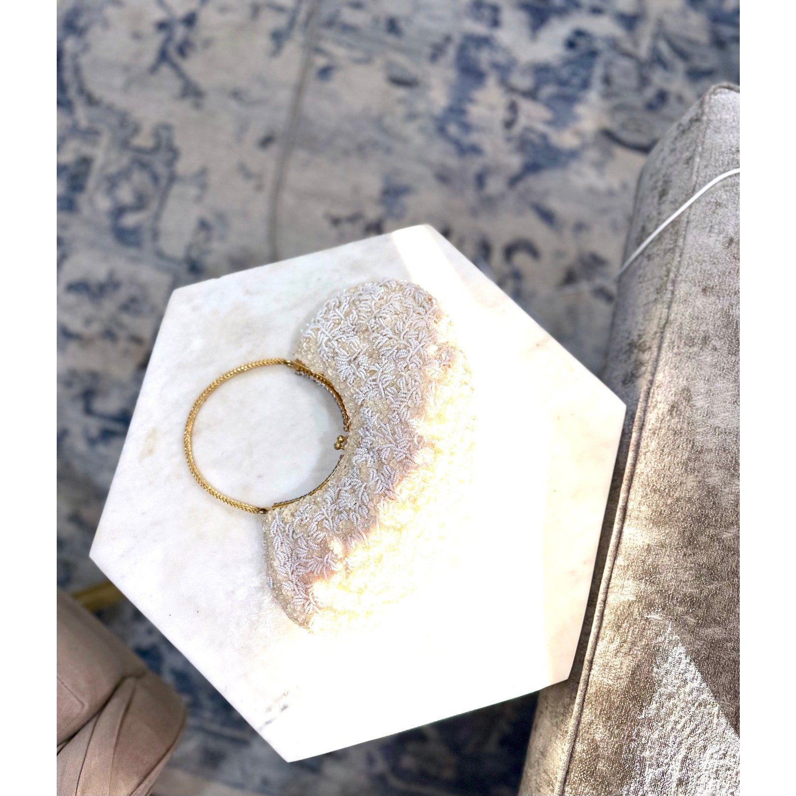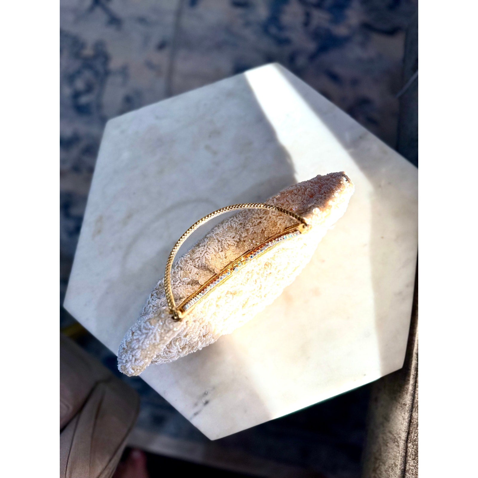 This vintage evening bag exudes timeless elegance. The cream and white beaded design is accented with sparkling rhinestones, creating a glamorous and eye-catching accessory. The bag features a stunning gold handle, adding a touch of luxury and sophistication.