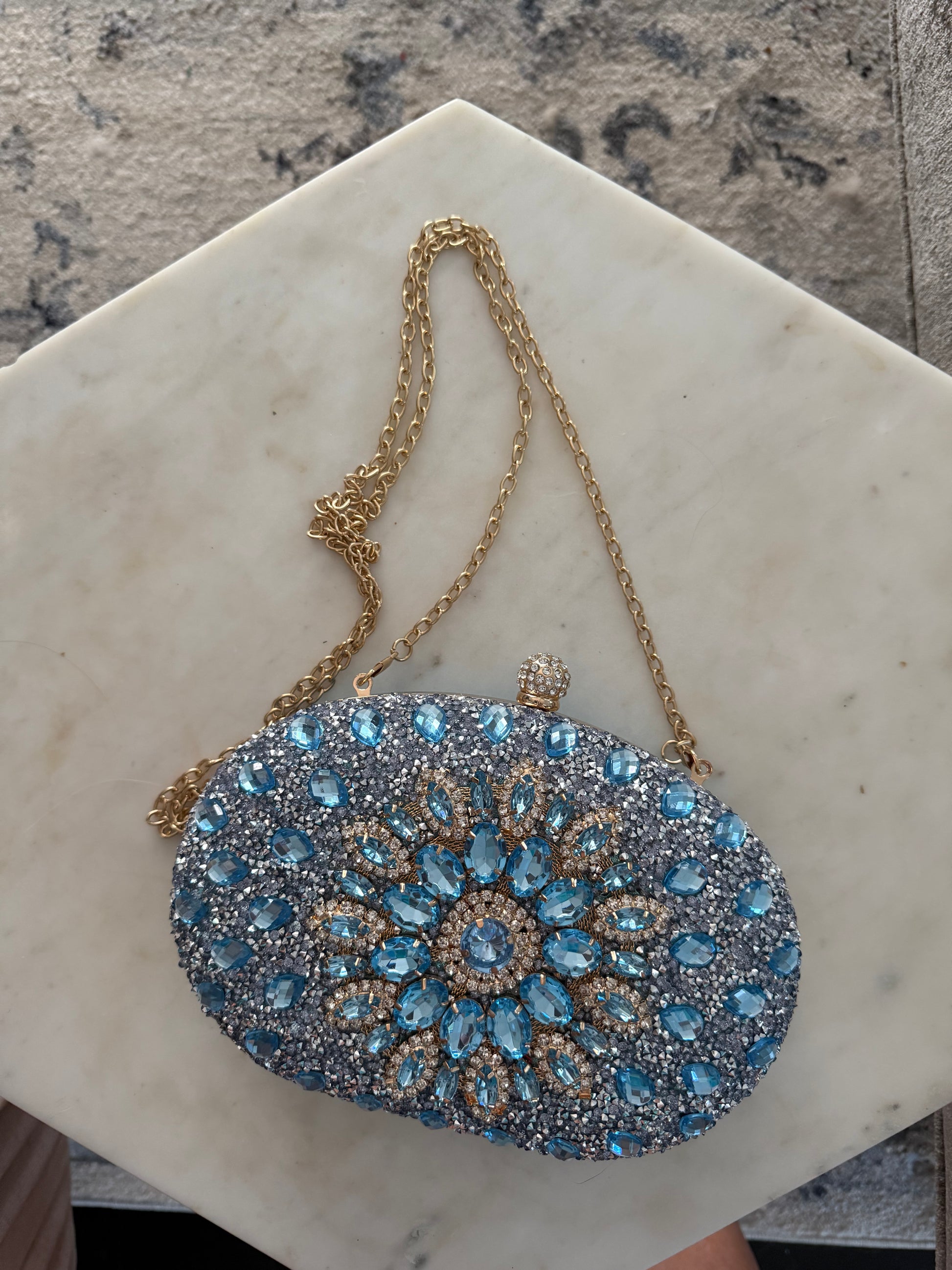 Stunning beaded satin clutch bag with double chain and butterfly embroidery with beads. Upcycled by adding Swarovki crystals. Gorgeous! Rare find.