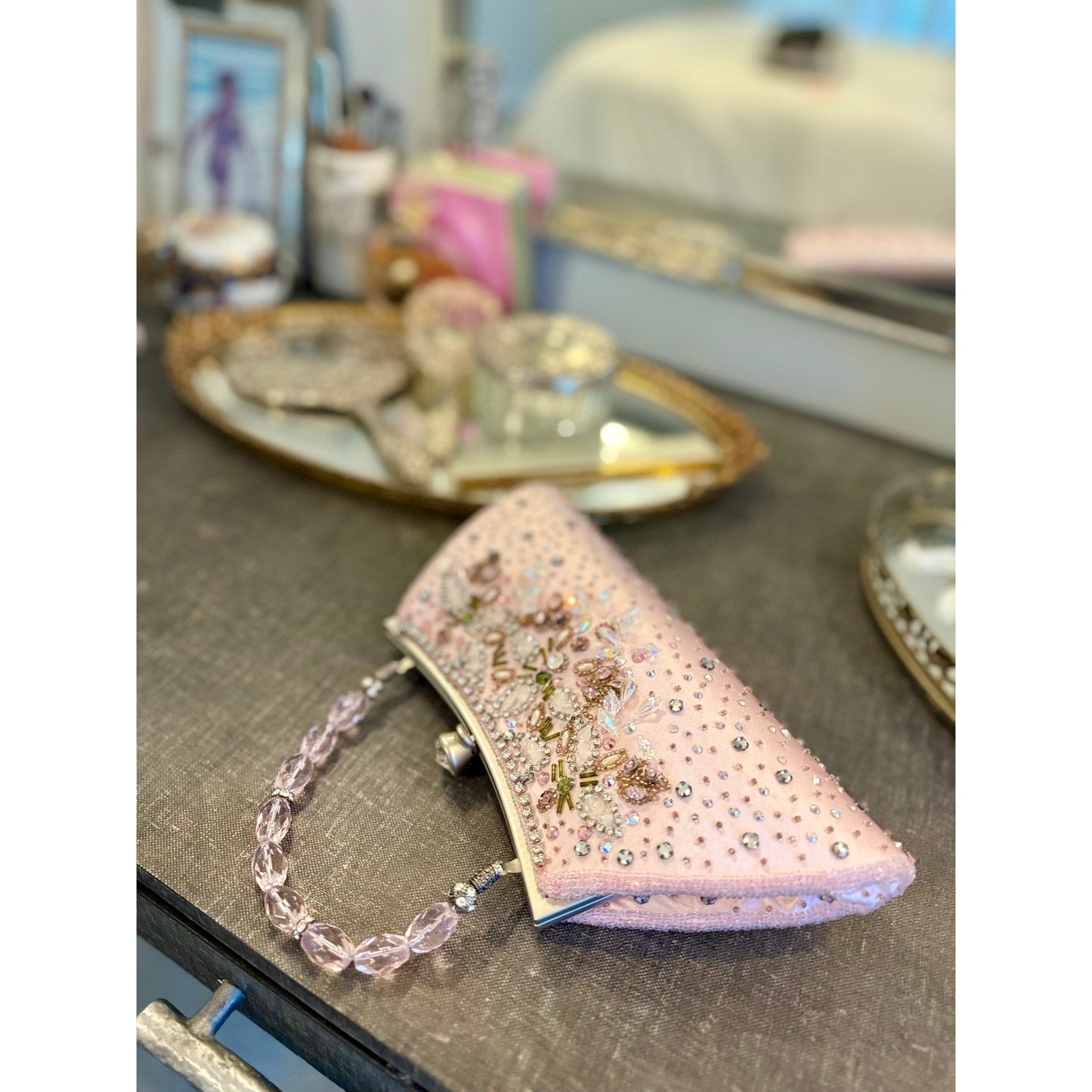 Vintage pink satin embroidered purse with silver clasp, beading and tons of rhinestones and silk lining A rare vintage classic, gorgeous , and in Excellent condition.