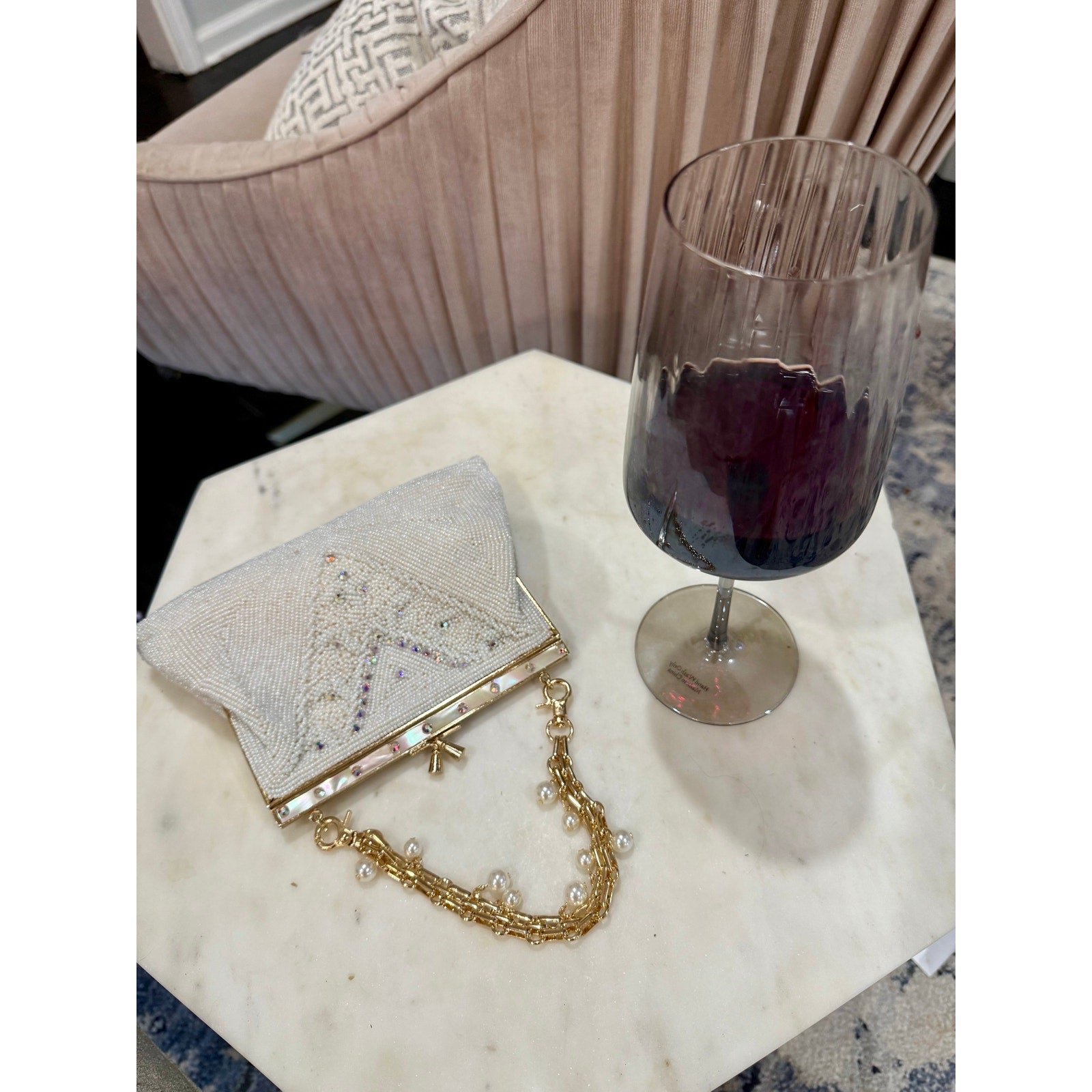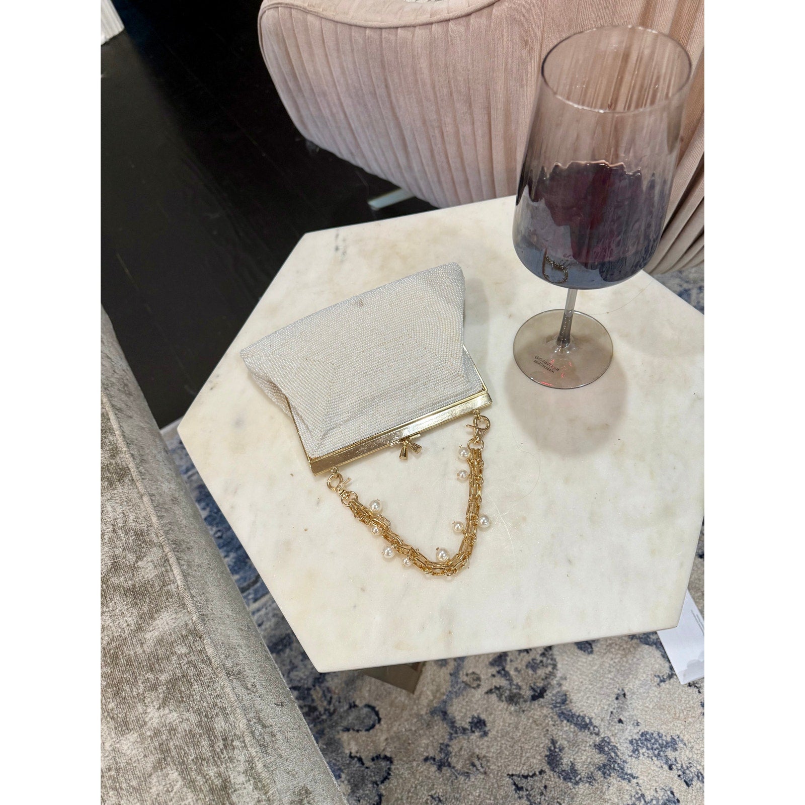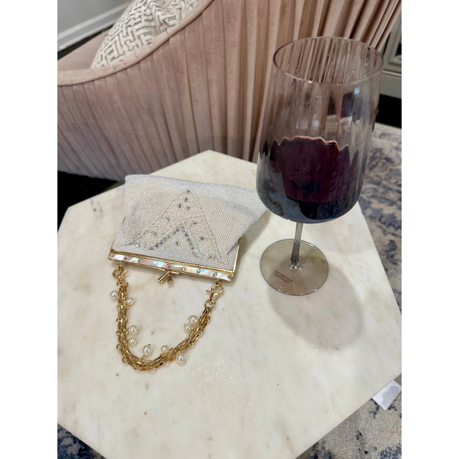Vintage off white beaded purse with gold clasp , new gold and pearl chain, swarovski rhinestones and mother of pearl detail. A rare vintage classic, gorgeous , and in Excellent condition.
